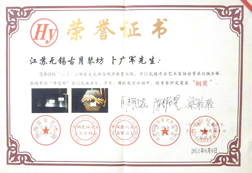 2011年卜广军受邀参加由当代音乐艺术学院、中国民族音乐艺术家协会等单位联合举办的首届“华艺杯”全国民族器乐、声乐、舞蹈展演活动中,老红木二胡获得金奖称号。